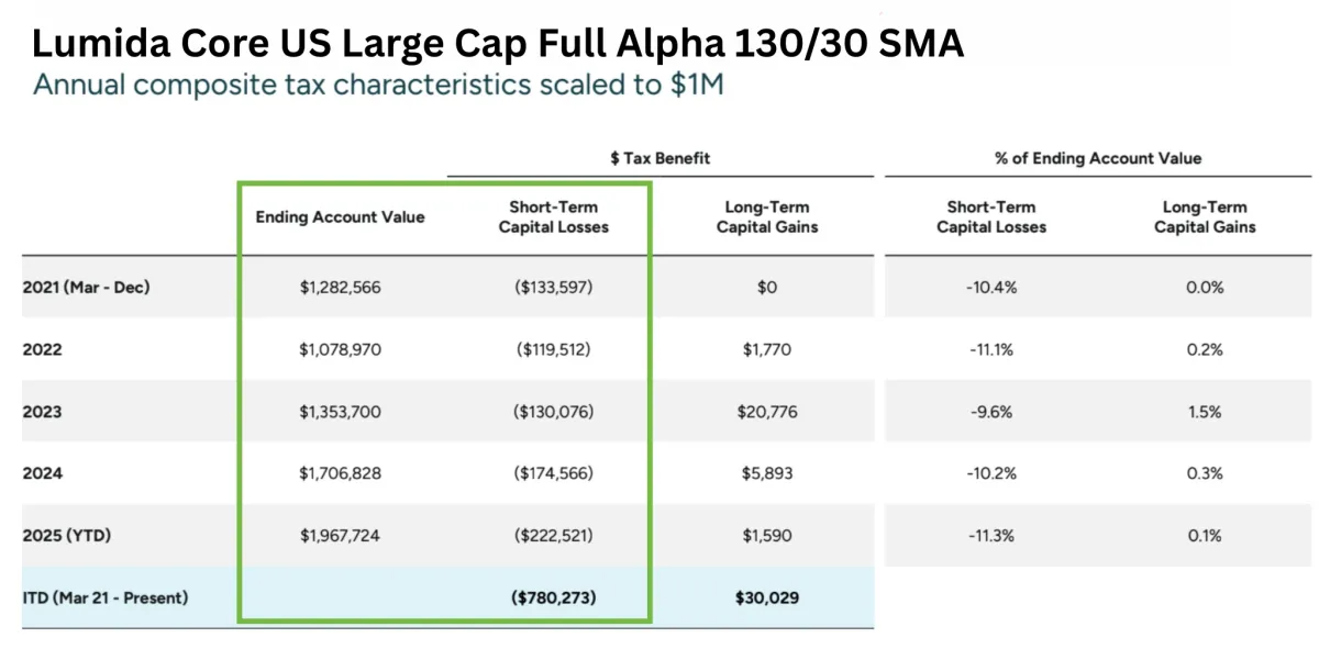 At $3M and above, the strategy reaches its full potential. In certain market conditions, year-one harvested losses have reached 30–40% of initial capital, meaning a $1M account could potentially generate $300–$400k in tax assets during the first year.