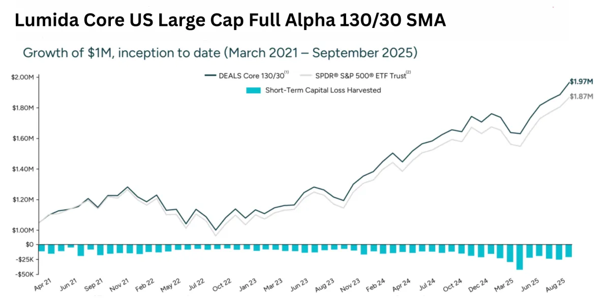 This chart shows the performance of $1M invested in Lumida’s Core US Large Cap Full Alpha 130/30 SMA.